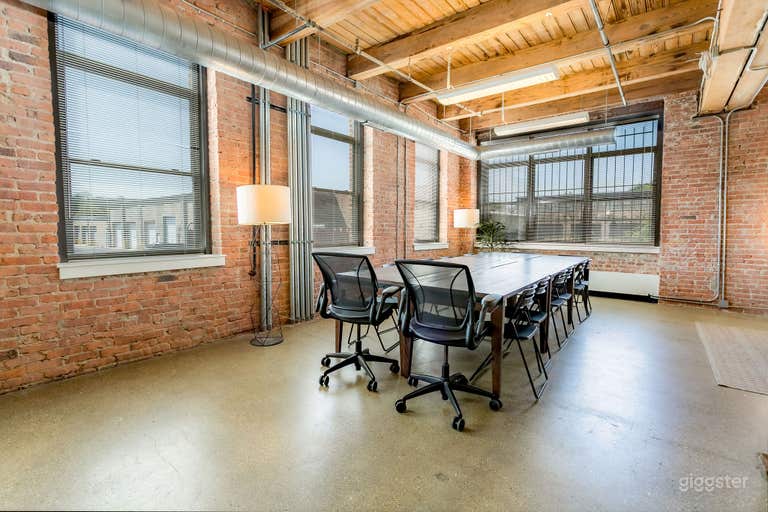 Urban Industrial Timber Loft Building with a Mid-Century Modern Inspired Creative Space for Podcast Hosting, Meetings, Workshops, and Photoshoots. Features natural light and a private vanity room. The loading dock is easily accessible and located on the same level as the studio.