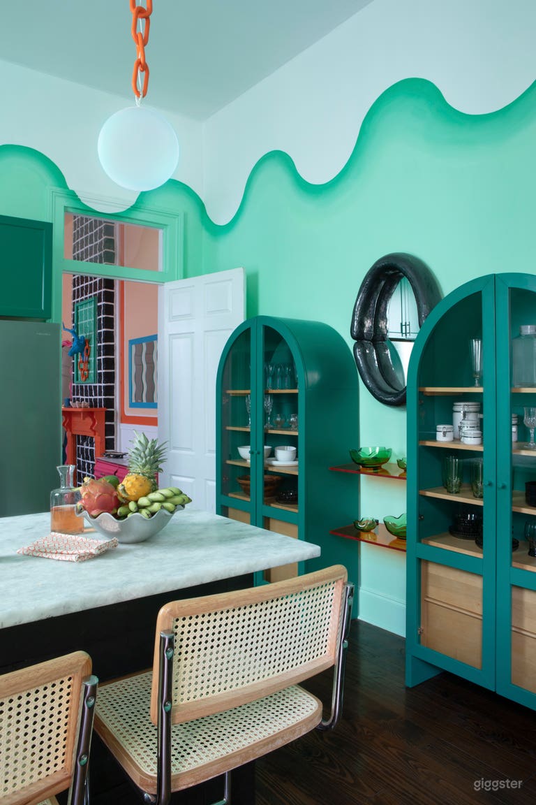 This 1920s New Orleans shotgun home is recently renovated and decorated in a wildly colorful way, combining a variety of design styles from Art Deco and Memphis to Pee Wee's playhouse. The house features bold colors, chain chandeliers, and a variety of custom furniture, such as a tiled - bathtub inspired bed, and a surreal backyard, painted to look like a giant David Hockney-esque pool. Featured in Domino Magazine's 2022 Spring Issue https://www.domino.com/content/jassy-choke-hole-new