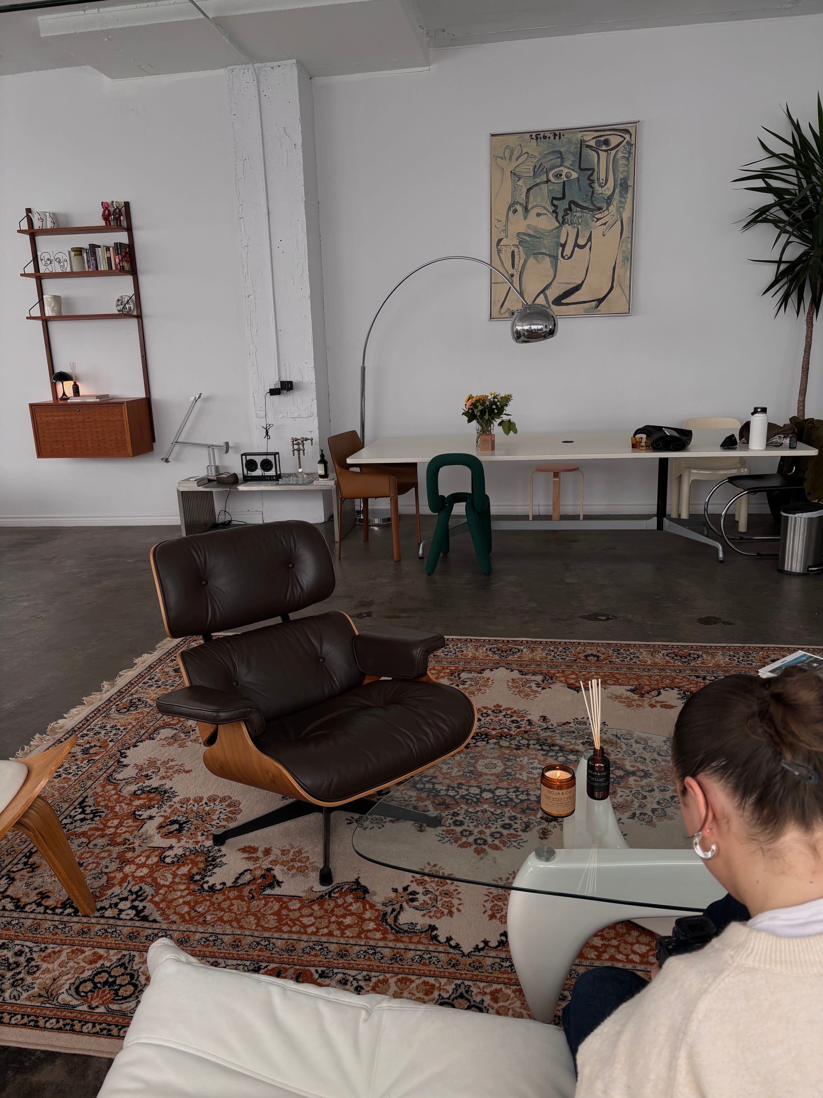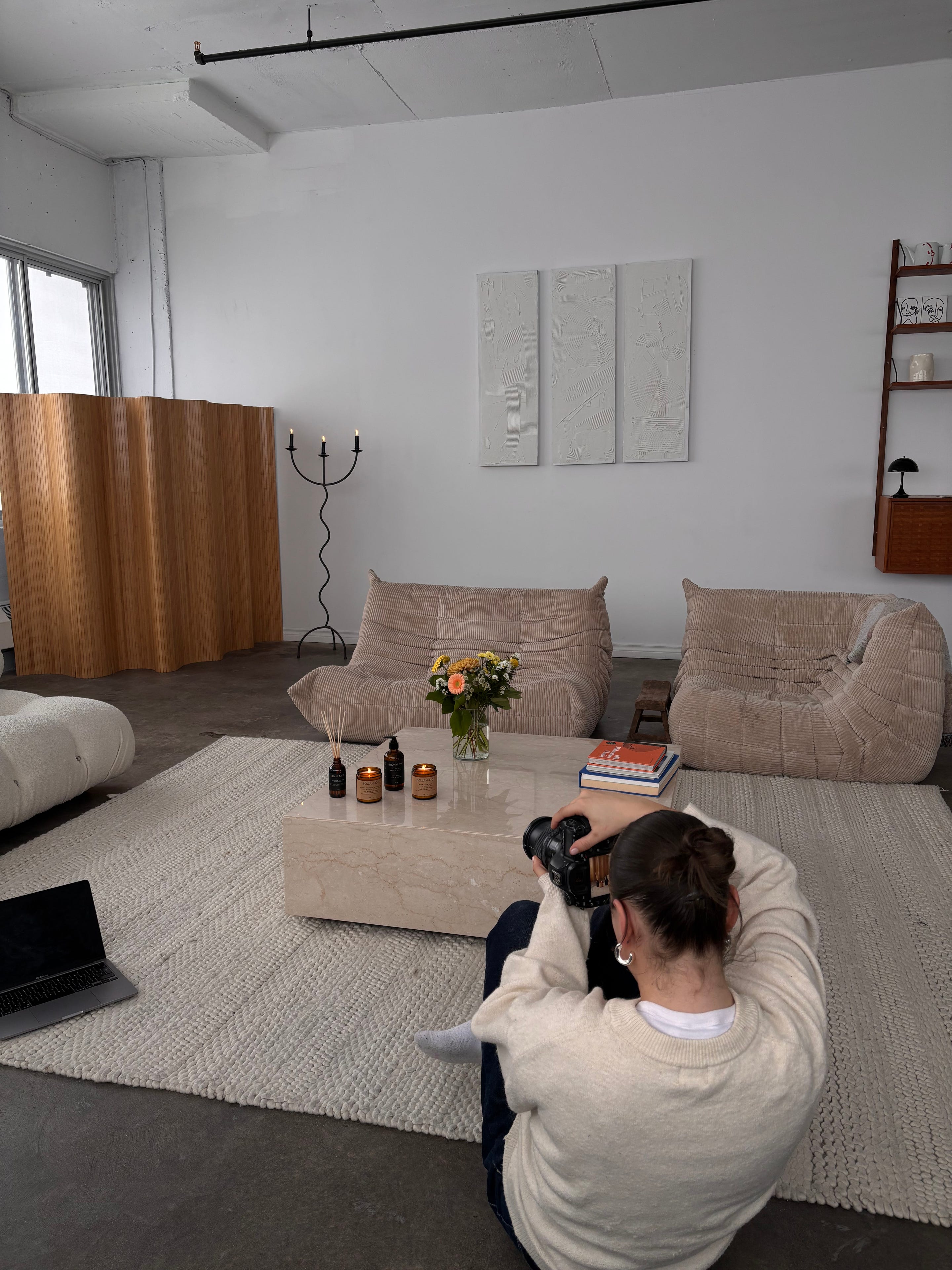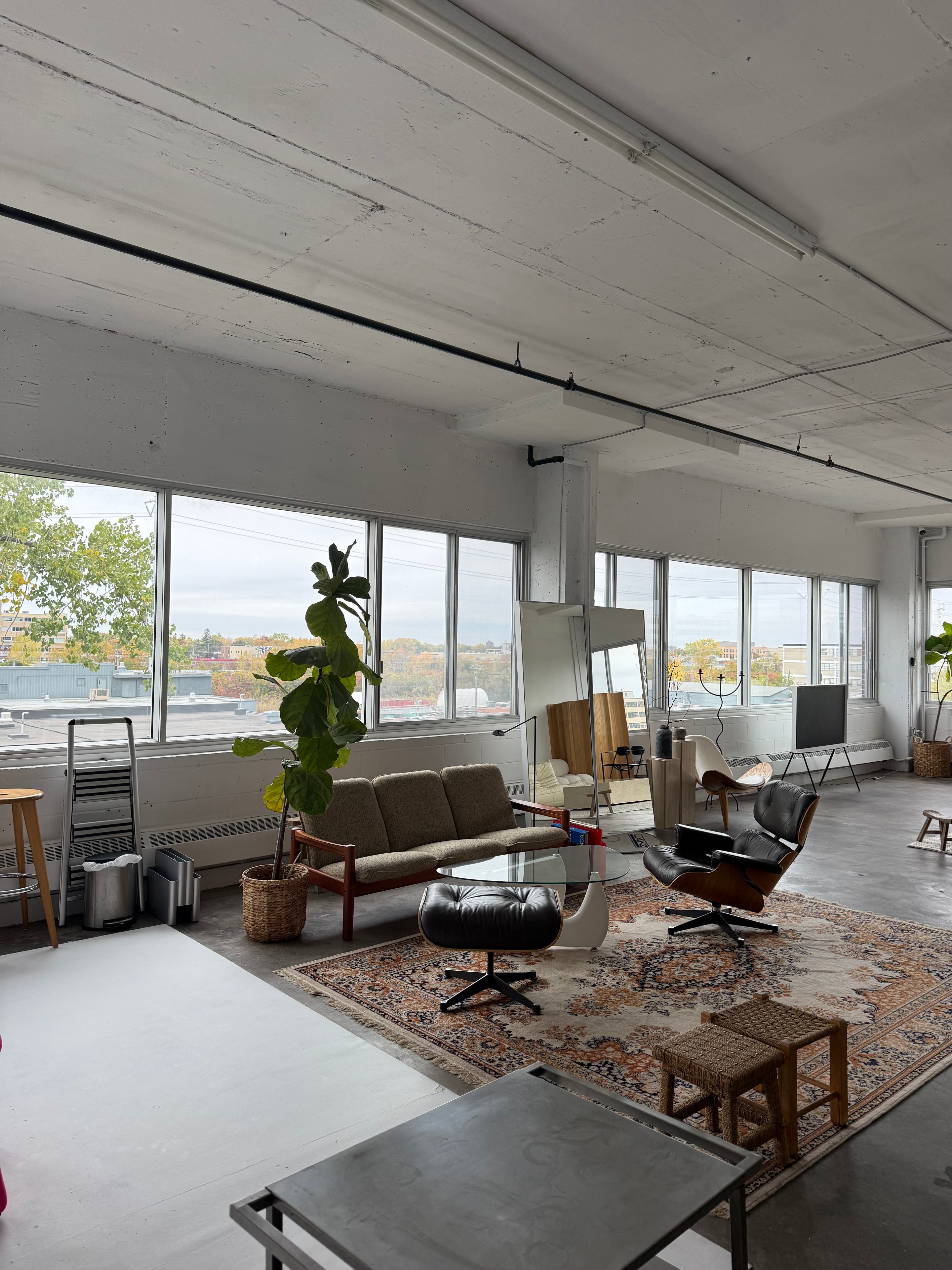 Our studio is immersed with abundant sunlight and creative energy. The space features soft rendered walls paired with polished sealed concrete floors. The custom detailing works to bring unique textures forward like never before in a creative studio. Located in a cornet unit of what used to be a factory the industrial architecture combined with the oversized windows surrounding the space make a statement on their own. The palette of calming neutral tones is design to match any aesthetic. We have chosen each piece of furniture to bring a sense of wholeness to the space, with a minimalist mindset and salutogenic design