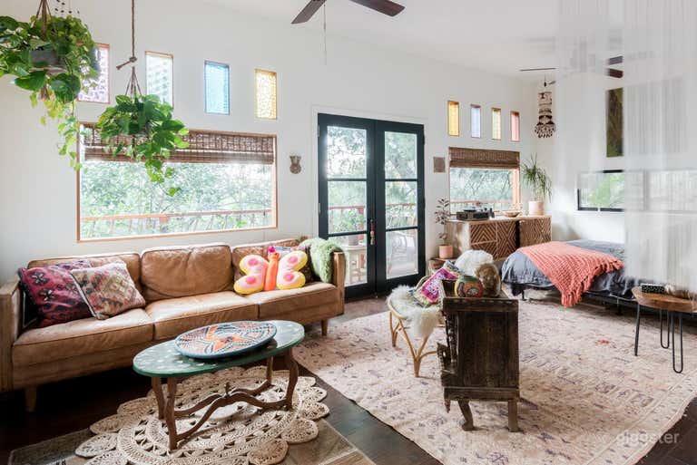 THE CABIN A1950’s bohemian dream cabin with beautiful wood paneled walls fill the space with an unforgettable warmth. A sunken light-filled living room with large windows, soaring ceilings, exposed beams and retro 60’s fireplace as the focal point. Stained glass, rainbow prisms, and skylights are artfully positioned throughout the home for dramatic lighting effects and ambience. In the center of the cabin is a historic kitchen with copper details and a wood burning brick oven. Cozy seating nooks are scattered throughout filled with plants, original artwork and texture. French doors open to a terraced garden sprawling with giant ferns, bamboo hedges, and tropical plants create a cool jungle vibe. LIGHT / SOUND There is plenty of natural light that shines inside the home at different parts of the day depending on the time. Overall the lighting is consistent throughout the day and by sunset the house is illuminated with a warm golden glow. Outside you have the options of shooting in full sun on the hill or beneath the tree canopies with speckled or direct sunlight. The entire property is about 1.5 acres ft with plenty of options to capture the perfect shot depending on your needs. Since the home has very little neighbors close by and is tucked in between two hills, there is little to no ambient noise. Most of the noise you will hear outside are the birds chirping in the trees or the occasional hawk family that lives on the hill. PARKING There is parking located directed outside the cabin for large trucks or vans. Street parking is readily available throughout the neighborhood and there is no street cleaning in my area. Additional parking for larger crews can be found down the block if needed. BOOKING All bookings must include setup and tear down time. If the booking goes over a 12 hour day, overtime will be calculated at 1.5x the daily rate. For larger crews or multiple day books please contact me for a custom quote. HOURLY RATES 15+ cast / crew: ask for quote