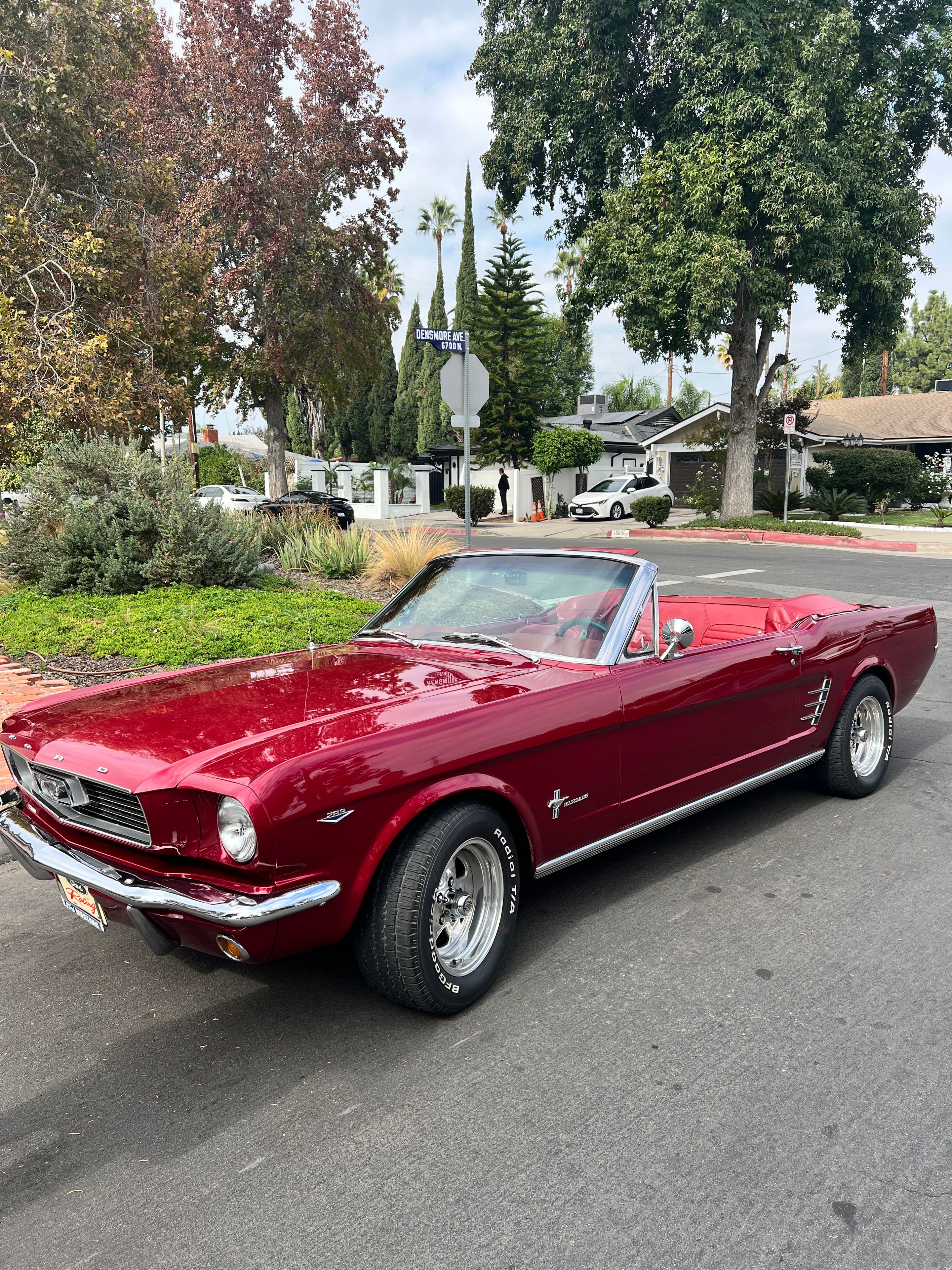 ICONIC 1966 Mustang Convertible Cruise California in vintage style with our jaw-dropping '66 Mustang, a ruby red legend with a V8 soul! This car turns heads, starts conversations, and photographs like a dream. Drop the top, cue the sunset, and let the 289 V8 do the talking. What’s Under the Hood: -Legendary 289 V8 engine -Edelbrock 4-barrel carburetor & performance intake -Dual Flowmaster exhaust (that perfect deep growl) -Smooth 3-speed automatic What Makes It Stand Out: -Stunning ruby red exterior with matching red interior -Power convertible top -Power steering & brakes for an easy, comfortable ride -Modern 3-point seatbelts for safety -Included: Bluetooth speaker + charging bank for your tunes & phone PLEASE NOTE: This vintage Mustang drives a bit differently than modern cars, with looser steering and softer brakes. Please take care of her! She means a lot to us and we want her to shine for every renter.