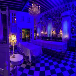 This private home in a high ceiling loft with two life size doll houses built inside, has a ballroom floor and a petite indoor garden gazebo. With chandeliers and candelabras everywhere, rococo design features, a hundred mirror wall, the unique interior style is 'Alice in Wonderland meets Marie Antoinette'.