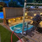 Spacious outdoor area featuring a large pool with a diving board, hot tub, gas barbecue grill, fire pit, picnic table, and a designated dog run. The space is exceptionally clean and comfortable, offering both warm and cool spots for relaxation. Guests can also boondock in our Airstream RV, which is available for convenient bathroom breaks. Enjoy your favorite tunes with the Bluetooth music receiver and outdoor speakers surrounding the pool and hot tub. Feel free to message us with any questions!
