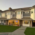 Stunning two-story home combines classic charm with modern sophistication. The exterior features a striking gray and white color palette, accented by elegant bay windows and detailed trim work that enhance its architectural appeal. Brick columns and accents add warmth and texture, grounding the design with timeless character. Large glass doors and windows flood the interior with natural light, creating a seamless connection between the indoor living spaces and the beautifully landscaped backyard. The spacious lawn and play area make it ideal for family living and entertaining. From the backyard, the home opens to a breathtaking patio with sleek, contemporary outdoor furniture and a fireplace, all set against panoramic views of rolling hills and the city skyline beyond. At sunset, the view transforms into a serene, golden landscape — the perfect backdrop for relaxing or hosting guests. This residence beautifully blends elegance, comfort, and California-style indoor-outdoor living.