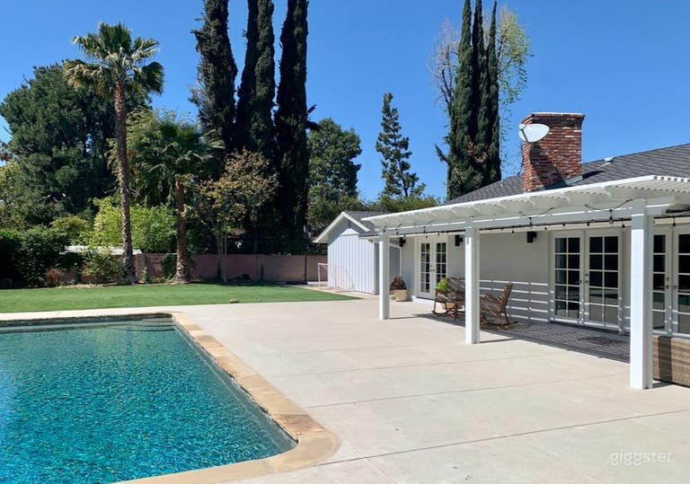 Please inquire within for film rates. Ranch style home on 1/2 an acre. Huge backyard, beautiful landscaping, pool, jacuzzi, pergola, and pavilion. One story mid-century design more. Home office, playroom, gym, 2 kids rooms and master. Lots of trees and greenery. Very easy street parking. Message here to book.