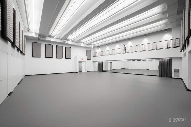 LARGE (912 sf) studio, 38'x24' with 11' ceiling, sprung dance floor, bluetooth speaker, chairs, upright piano, mirror and curtain. The complex boasts a total of 22 flexible spaces of differing sizes across 50,000/sf, which can be combined to create the ideal venue for your filv/video/photo shoot, holding, craft services, off-site meeting, conference, or networking event. Used regularly for Broadway rehearsals space and as a studio for photography and film the space is available for any type of event imaginable. 38’ x 24’ x 11’h