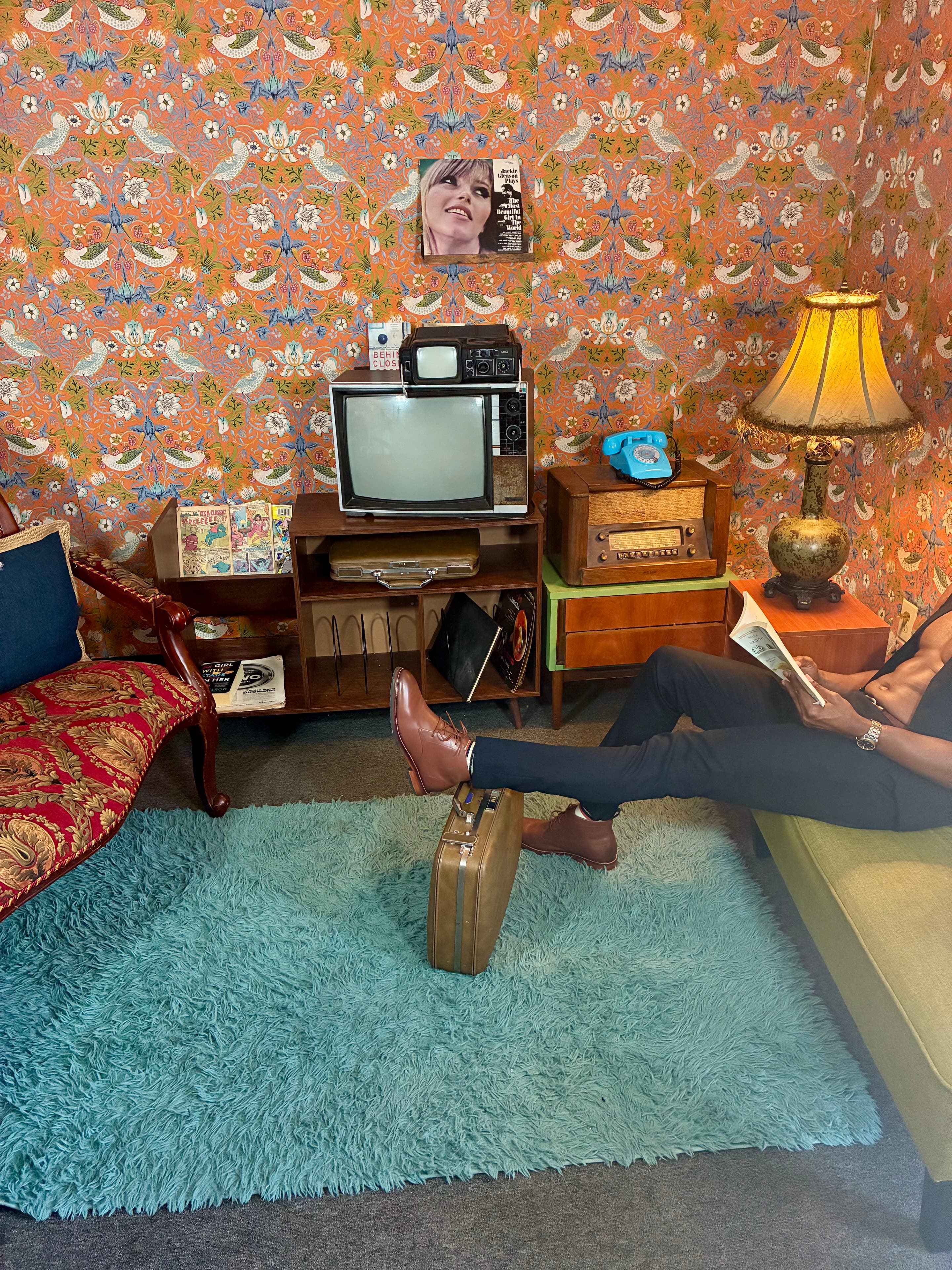 Introducing our retro-themed studio space, a nostalgic haven for creators, photographers, and videographers. Divided into four sections, each exuding its own unique charm, this space offers a delightful blend of vintage aesthetics and modern functionality. As you enter, the first thing that catches your eye on the right is the vibrant green wall, tastefully adorned with curated vinyl record album covers. This room is perfect for content creation, podcasters, and captivating photoshoots. On the left of the green wall, you'll find a delightful blend of old and new styles, where traditional materials and finishes meet contemporary design elements. This section is ideal for content creators, video shoots, and photoshoots, offering a versatile background for your creative endeavors. Take a step into the next section and be transported back in time to a nostalgic retro parlor reminiscent of the 70s. The walls feature rich brown wood paneling, emanating a cozy and inviting atmosphere.. A classic retro telephone from the 40s sits on a side table, showcasing the timeless elegance of days gone by. This space is perfect for capturing retro-inspired videos and photoshoots that aim to capture the essence of a bygone era. Finally, we have "The Pink Flower Wall," an area that promises a fun-filled experience. Adorned with pink floral wallpaper, complemented by wooden furniture and vibrant flowers, this section exudes the vibrant vibes of the 70s and 80s. It offers a playful setting for capturing videos and photoshoots with a touch of retro flair. In our retro-themed studio space, you'll find an array of distinctive areas, each thoughtfully designed to inspire creativity and provide a backdrop that celebrates the charm of the past. Whether you're a content creator, photographer, or videographer, our studio is the ideal location to bring your creative visions to life.
