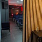 Warm, production-friendly venue with a stylish wood-slat entry, flexible seating, and a ready-to-go stage. Perfect for live recordings, worship services, talks, panels, photo/video shoots, workshops, and small concerts. Step in from the street to a bright goyer framed by anewly bult wood-slat partion–an eye-catching backdrop for welcomes, step-and-repeat shots, or check-in. Grey-oak biunly flooring keeps the entrance clean and modern. Beyond the foyer, the space opens to an intimate hall with ~30-35 navy, cushioned chairs that can be rearranged for theater, classroom, or open-floor layouts. Matte-black harwood floors contrast with a burgundy, carpted stage for a professional look on camera and in person. The stage is set for plug-and-play use: podium/lectorern centered, LED wash/accent lighting, and a compact media corner to the side for DONTE enabled audio/visual control.