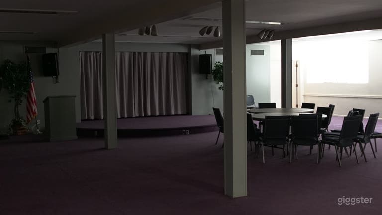 A large cafeteria-style hall with tile floors lined with pillars. Cap 150. Has a large, industrial-style kitchen attached. Well suited for events and presentations where food is served. Stage is equipped with a couple banks of stage/party lighting.