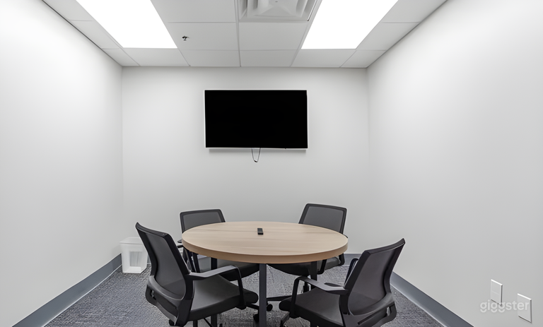 This medium-sized meeting/conference room is perfect for team meetings, virtual calls, and shoots that need a professional setting. With comfortable mesh chairs, a modern white table, a wall-mounted screen, and simple design elements, it’s ideal for focused collaboration or polished video content. The minimalist vibe and neutral tones make it easy to adapt for various business and production needs. This meeting room is available for Meetings and Photoshoots/Filmshoots.
