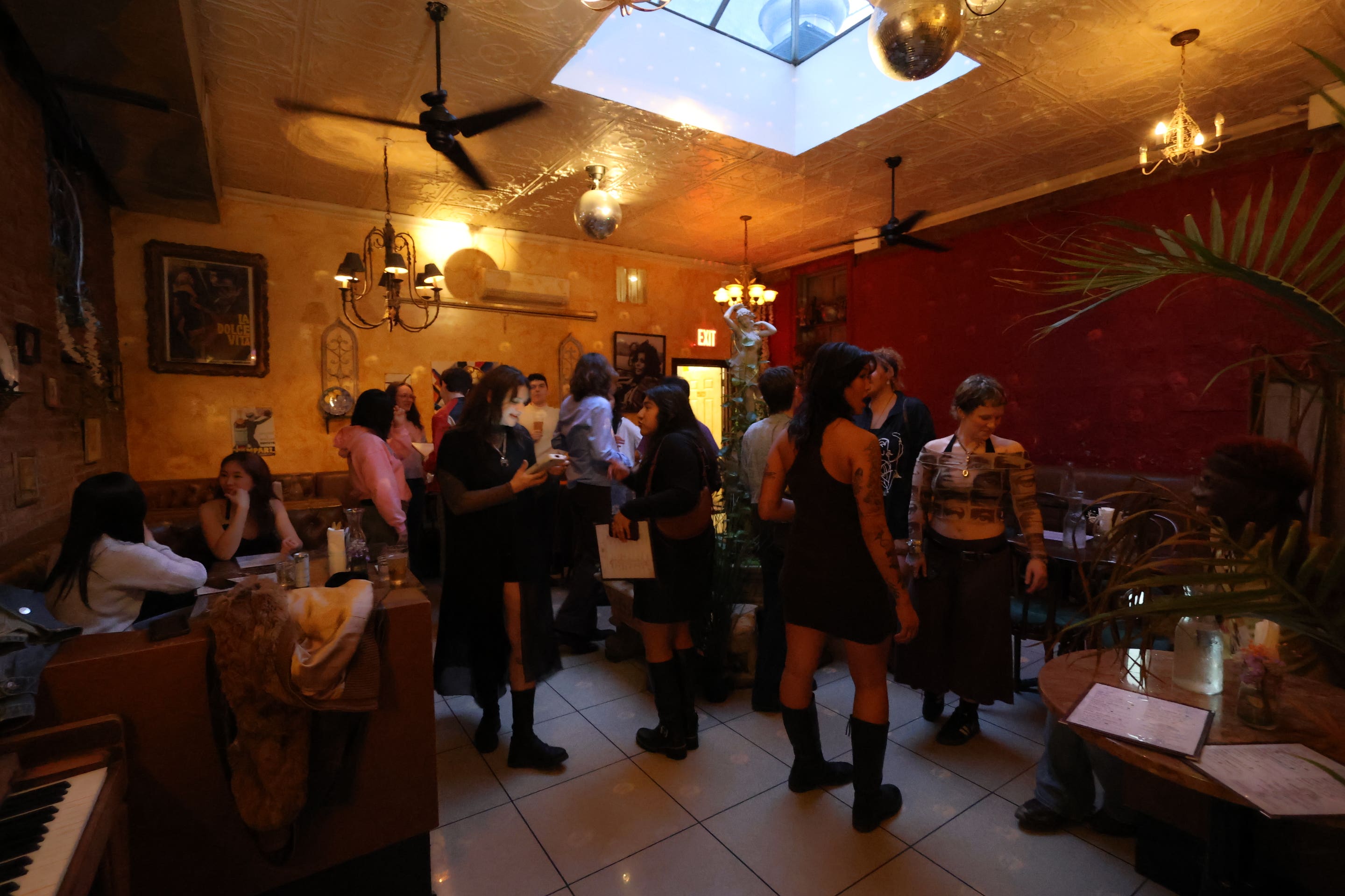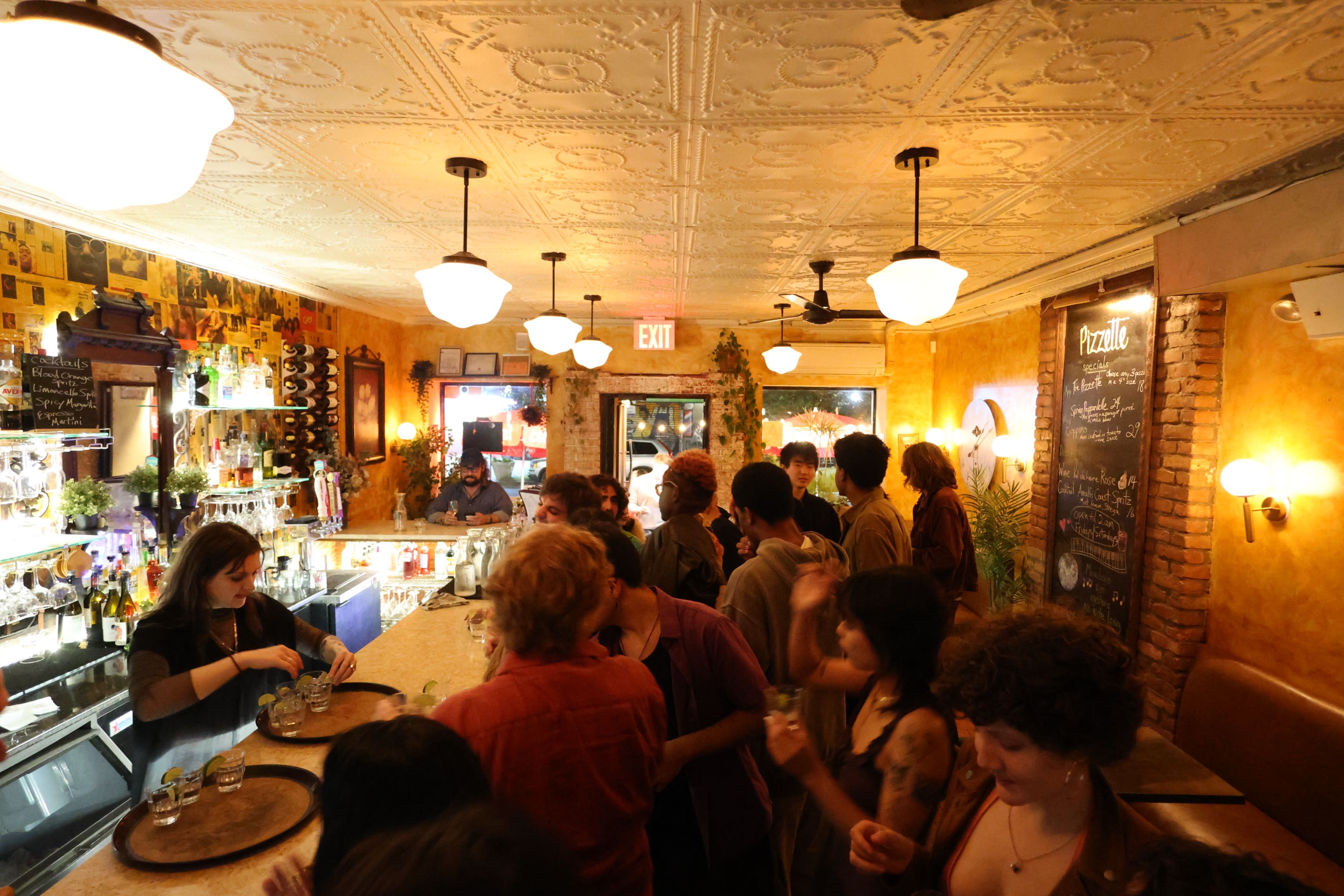 Rustic Trattoria with vintage decor. Tin ceiling, brick walls, booth seating.
