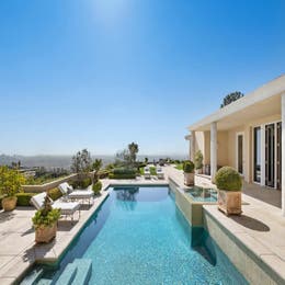 This stunning outdoor space offers a private retreat featuring a sparkling swimming pool and an integrated hot tub, ideal for relaxation and photo shoots. The expansive patio area, paved with elegant stone, provides ample space for sun lounging and an outdoor bar setup, complemented by lush landscaping and ornamental planters. Enjoy breathtaking views of the surrounding hills and cityscape from this serene Beverly Hills setting.