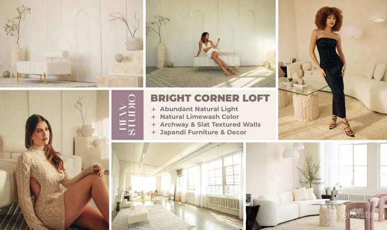 A dreamy multi-set production studio located in the heart of Downtown LA's Fashion District. We have multiple themed set designs, beautiful natural light with our tall loft windows, and modern geometric cut-out shapes such as a circle and three archways that look stunning in photos and video. We built layered platforms covered in white subway tile that reflects light beautifully to create a dreamscape vibe with 4 RGB light orbs that hang from the ceiling. We also have a lush floor to ceiling plant wall (artificial and real plants). SET DESIGNS: -Desert Dreamscape (sand pit with curtained archways, frosted globe lights, large circle window with stone platform and stairs) - Forest Dreamscape (reflective "pool"(epoxy) with curtained archway, basket globe lights, plant walls with stone platform, corrugated green backdrop) ALSO INCLUDED: - Multi-Purpose Backdrop Area (clean white walls, tall loft windows, backdrop rolls with 3+ color options) - Lounge Areas (couches, armchairs, rugs, lamps, coffee table) - Makeup & Dressing Area (LED vanity mirror and shelf, curtained changing area) - 2 Additional folding tables available PLEASE NOTE: - This space is NOT soundproof. Being in the heart of DTLA, we are subject to all of the city noise that accompanies it (fire trucks, ambulance sirens, etc), despite being on the 9th floor. Video interviews and other noise-sensitive productions are doable, but require mics that make that type of noise easy to remove in post-editing. If you need long forum audio with uninterrupted clips, we would suggest another studio as the downtown noise is unfortunately unpredictable. If the editing style allows for cuts, this is more doable. We've hosted several video productions/interviews but they are aware of this dynamic in advance. It's classic downtown LA street noise, almost NYC vibes. We welcome anyone to come tour the space in advance for larger video productions.