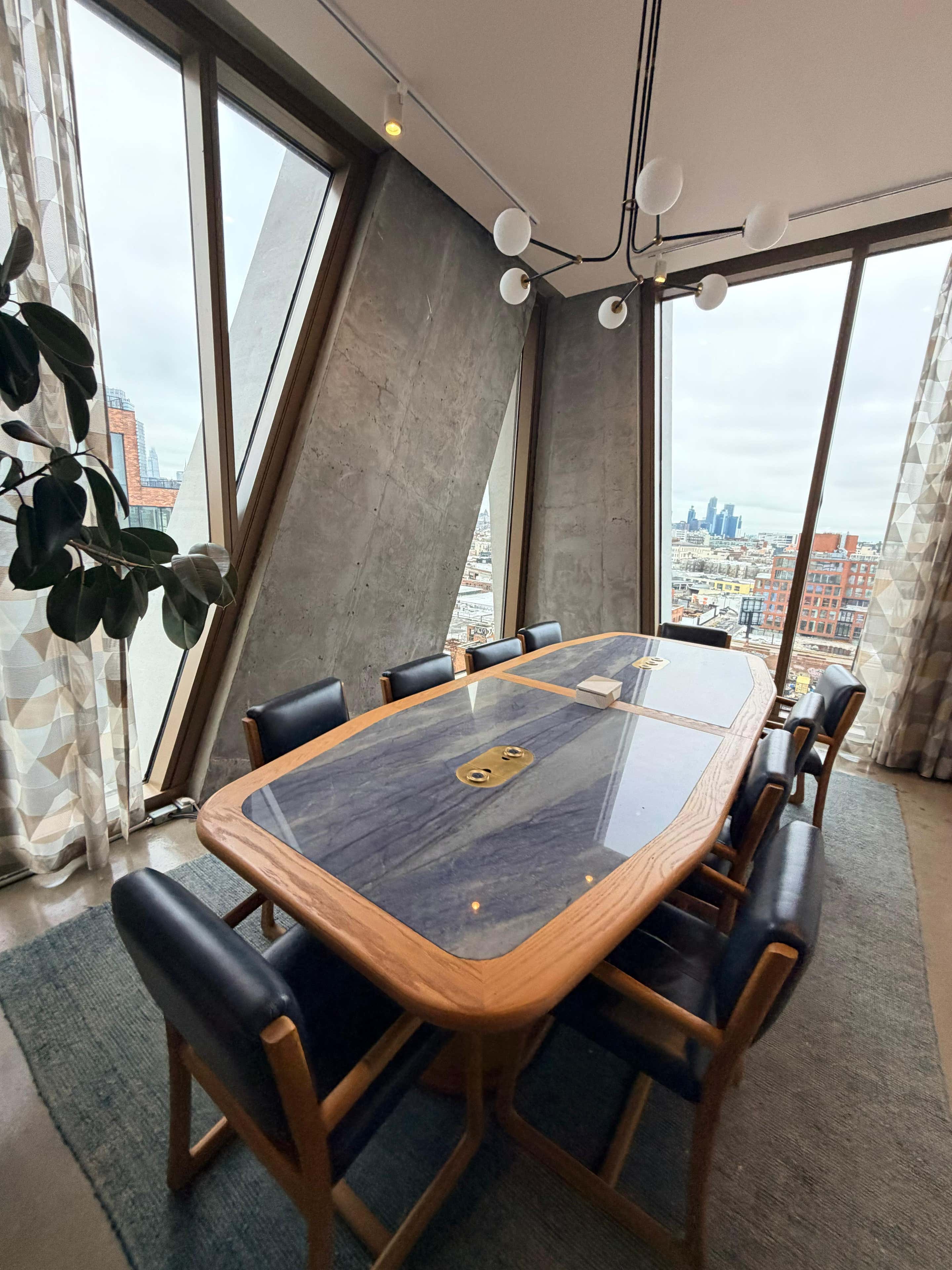 10-person capacity. This room has floor-to-ceiling windows overlooking Manhattan, the East River, and North Brooklyn. All our meeting rooms come with a 65" TV, full AV set-up for video conferencing and screen mirroring, conference table with built-in power, and white board.