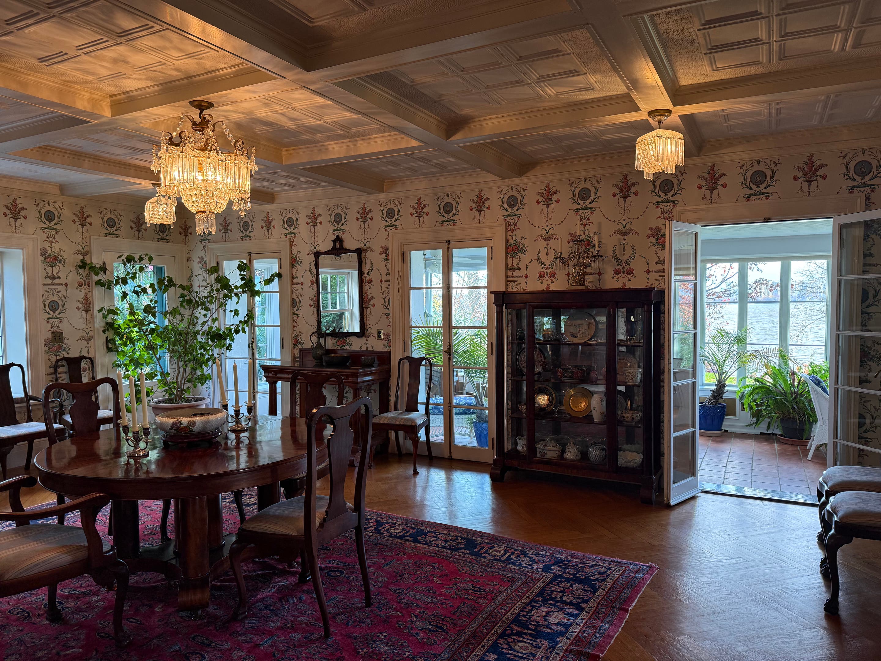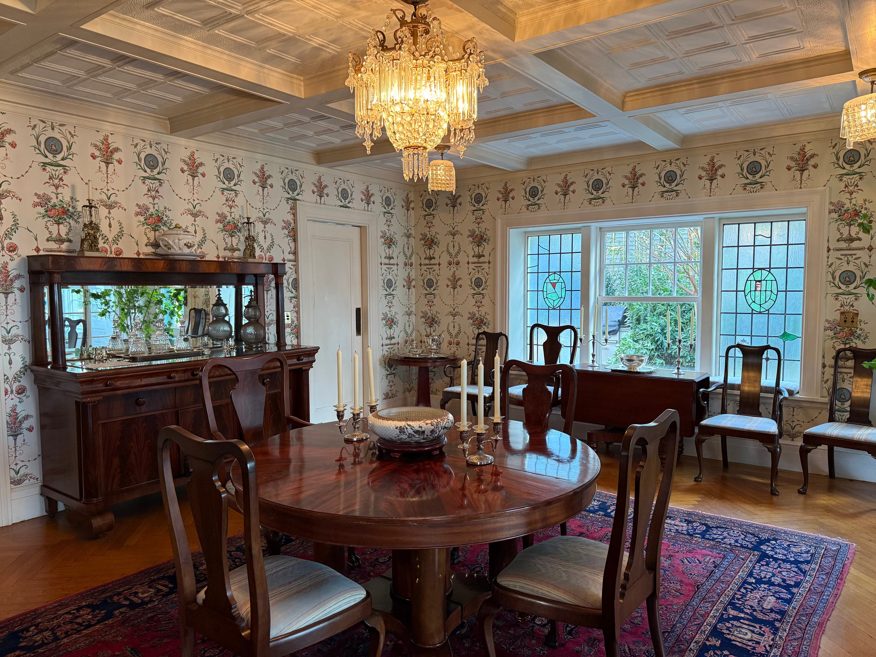 *Listing Updated April 2025 Mediterranean style stucco house with tile roof, built 1907, facing Little Neck Bay and Long Island Sound. Corner lot on one-way local street. Multiple long sight lines from room to room that may incorporate views of the yard and bay allow for tracking shots that follow characters as they move between spaces, and permit various camera angles that emphasize the flow of spaces that continue up the master staircase to second-floor landing. This flow, as well as ample windows, French doors, and picture windows, create a light, airy, and open feel. House maintains virtually all original features and details that add to the distinctive character of our home, such as wood beams and tin ceilings with embossed designs, crystal and colored glass chandeliers, stained glass windows, small mosaic floor tiles and hardwood floors, Persian rugs and Moravian tile fireplace depicting biblical scenes, French doors that span length of porch, and closets with "obscure" glass panes. Among furniture is varnished mahogany dining room table with growth rings that accommodates up to 16 with all leaves, Queen Anne chairs, and sixteenth century carved-oak rustic Spanish monastery table. Original cedar closet and crawl space for storage on third floor under eaves. In basement are industrial-style boiler room with period instruments, laundry room with three porcelain wash tubs, and wood wine cellar. House evokes era of "The Great Gatsby." Modern features include "endless pool" off of breakfast nook, and steam/sauna and whirlpool bath in master bath. View of two bridges, three boroughs — Bronx, Queens, and a few Manhattan skyscrapers — and Long Island. House offers various styles of rooms, views, angles, and types of shots. Four minute drive/15-20 minute walk from LIRR station. Free and ample street parking 6AM-10PM. Availability after 9PM for groups of 15 or fewer may be negotiable for an additional $100/hr late hours fee. No alcohol. No consistently loud noise. Restrooms available for groups of 15 or fewer. *We are open to discussing the possibility of a business pop-up event. **N.B. Pricing section indicates price for 16-19 people. A breakdown of our hourly rates per # guests are as follows: #ppl. rate/hr 1-5 $150 6-15 $200 16-19 $250 20-24 $300 25-29 $350 30-40 $400