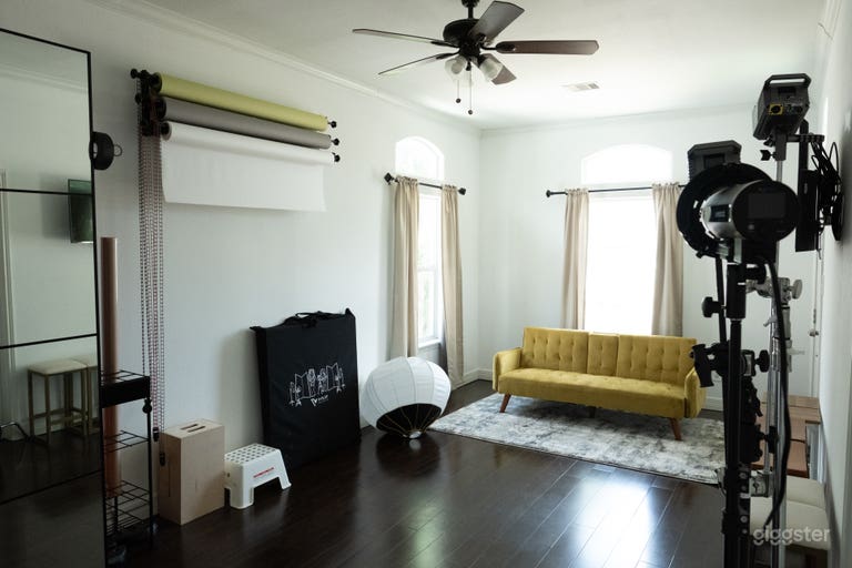 This space is a 1st-floor 600-square foot studio that offers substantial natural light, all white walls & floors, with large windows facing south. There is significant natural light in the space during daytime hours. A full-length mirror is available for use. Full-size bathroom with a working shower. South-facing lot in the front of the property is available for use. Studio space is equipped with lighting, backdrops, & accessories included at no additional charge. There are 2 lucite chairs available for use. There is plenty of free street parking available in front of the property. We love to show off your work! After your session send us edited photos you've taken and we'll print and hang them in the studio space and happily post them on Instagram.