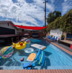 A small piece of paradise. It has everything thing you need to get lost for awhile. The space is great for relaxing daze or fun nites! (Photo shoots / Video scenes, Networking events, casual lounging and fun etc.) Large White Wall Cartoon front yard set Fire pitt lounge Pool with floaties Large Bar top Urban Art room with lighting