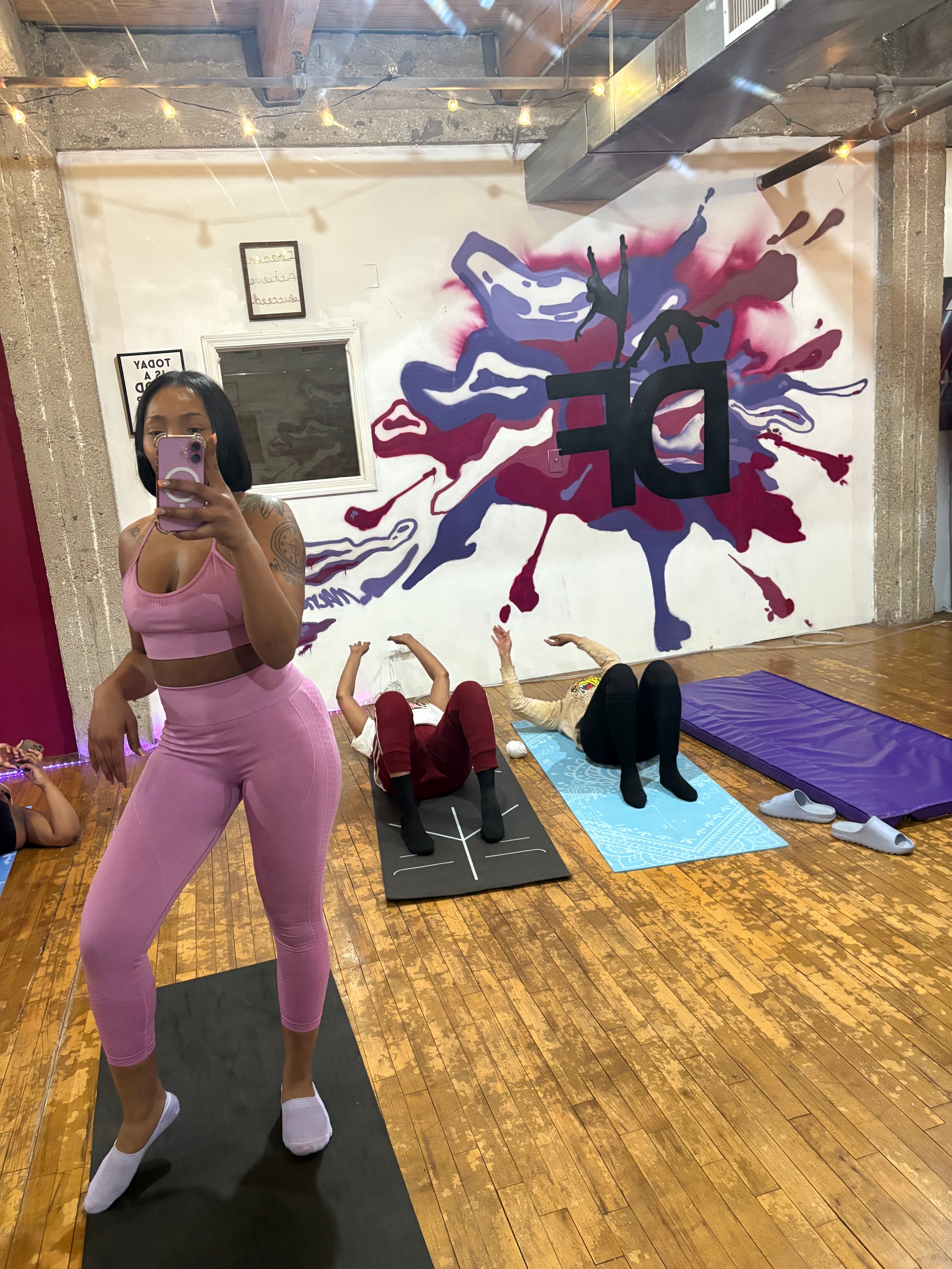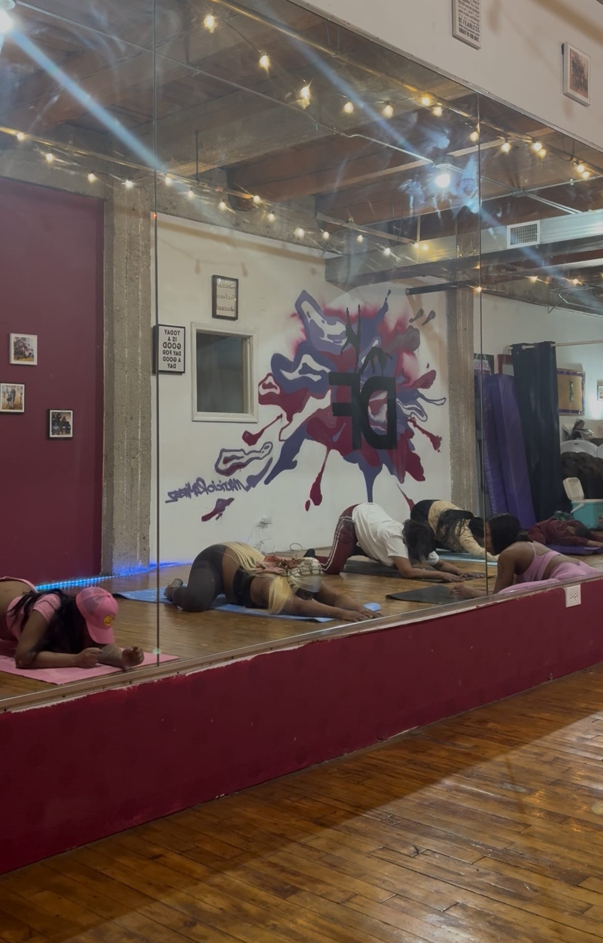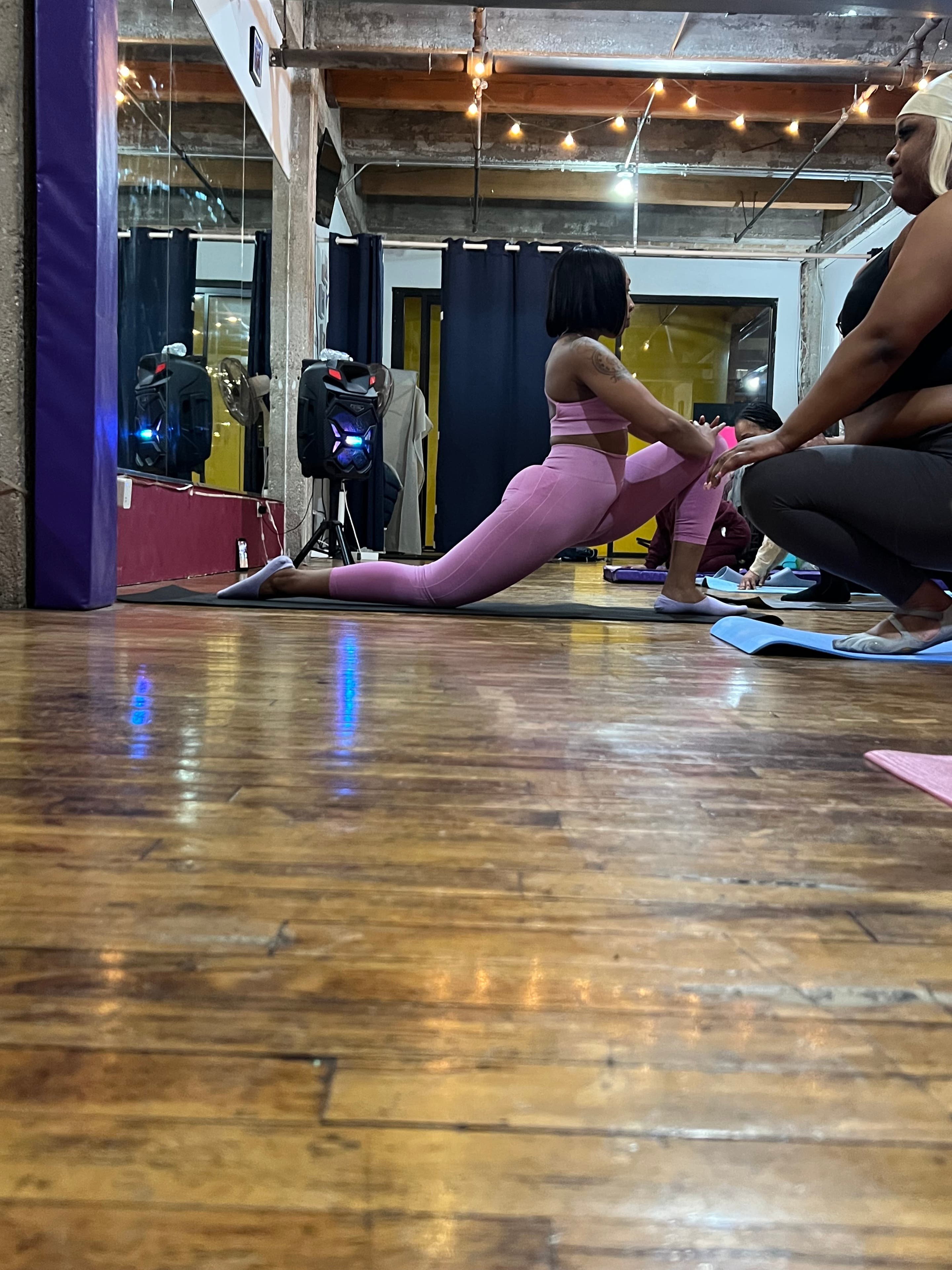 This space has vibrant colors and full mirrors on one side of the wall. Creatively designed to give off great energy. This space includes speakers and special lighting along with individual spotlights for use. Chairs and tables are also available for use if needed. Plenty of natural lighting, which is a plus!