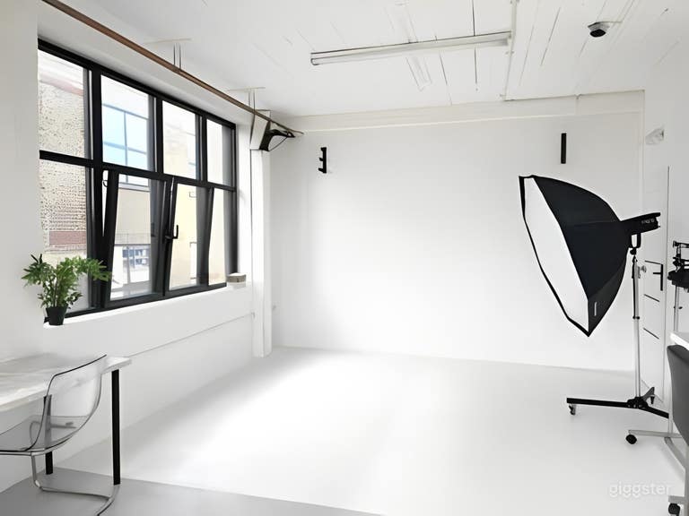 Versatile photo/video studio for hire in East London. here at our Studios this is our second studio, offering a 420 sq ft space at affordable rates catering to photoshoots, filming, workshops, casting and much more 2.72 x 11m white backdrop (1 metre onto floor, £10 per metre thereafter) 2 x Godox Strobe Lights 1 x octabox 48’” + heavy duty light stand with wheels 1 x softbox 24” + heavy duty light stand with wheels Chairs/Stools Feature wall Desk area & Large full length mirror Double hair and make up area Rail with hangers provided + steamer Kettle + free tea, coffee and bottles of water *Studio may look slightly different than photos due to damages/replacement items*