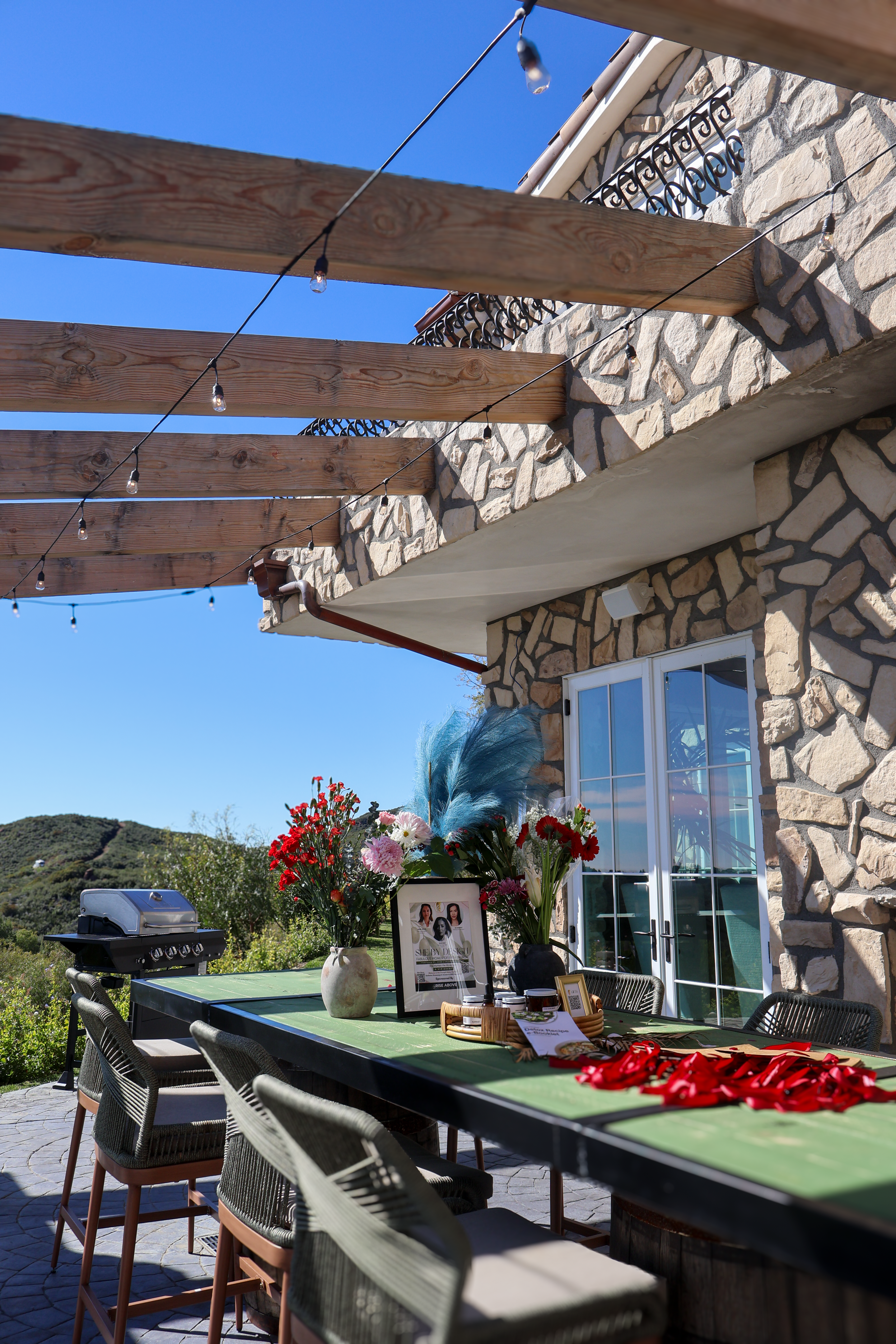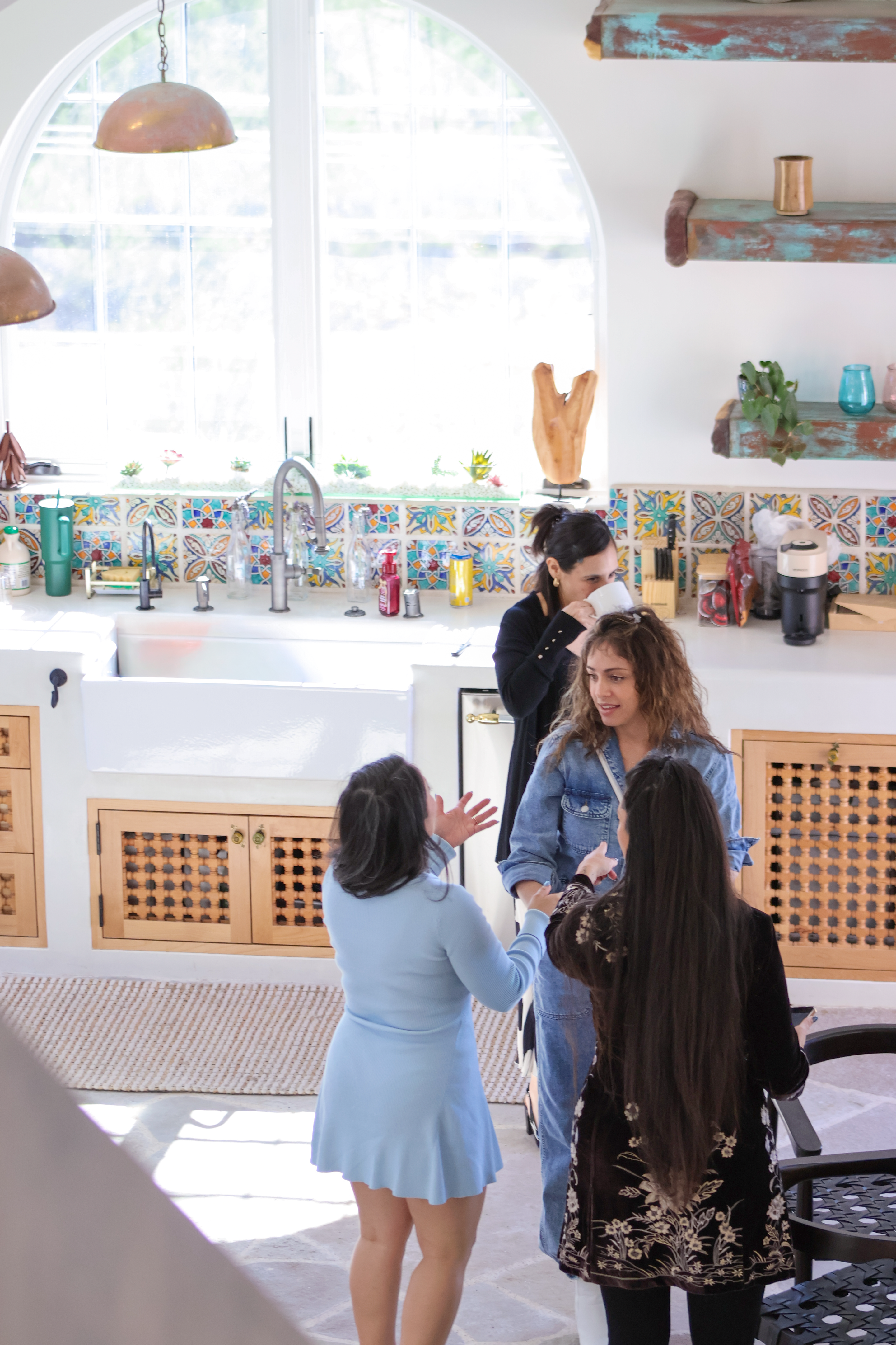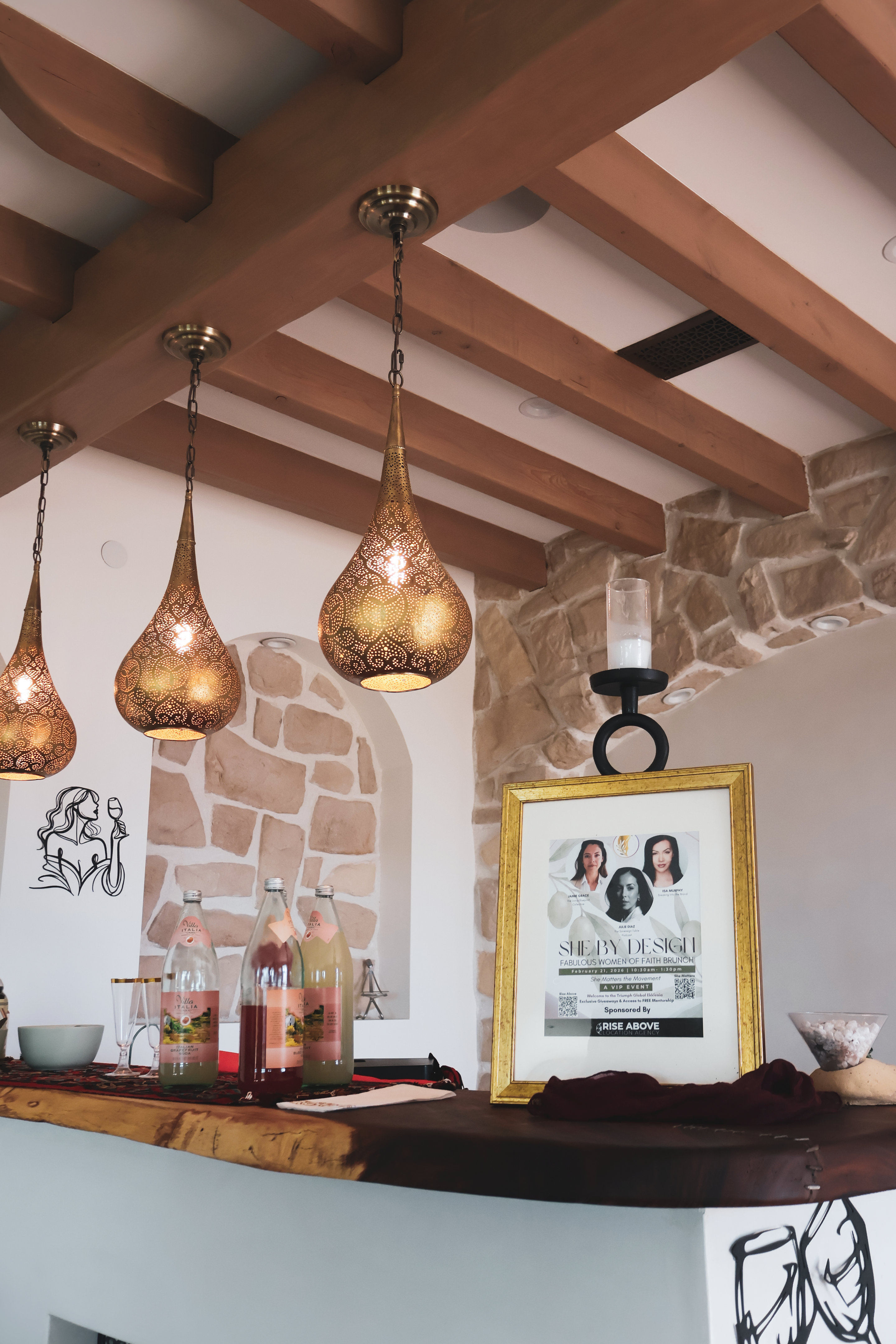 If you are looking for a retreat in Tuscany, look no further! I’m so grateful to Adam from Rise Above Location Agency for referring me to this Hilltop Escape in Malibu. The owner of this estate is Vittal, who is the most hospitable host you will ever encounter—an instant friend! The outdoor patio reminds me of the vineyards of Tuscany and they have a beautiful bar to match! Imagine having your wines poured at their bar with stone mosaic accents, Spanish styled hanging chandeliers, and dark wood counter, and then walking through the double doors outside to meet the dining table resting on two oak barrels with exposed vaulted beams above, and all looking over the cliffs of Malibu!! I had the pleasure of bringing 16 women to an empowerment seminar held in this estate. We had our beverages and greetings offered at the bar, then our table-scape of food in the dining hall with a cast iron statement piece of a chandelier and fireplace in back, and then held our teachings in their living room. After we held the seminar, we had our guests convene outside for pictures and our PR giveaways at the patio. The decor was tastefully vibrant pallet of mosaic tiling on the stairs, and arched bay windows that cast an amazing amount of light inside. The high ceilings were beautiful. They even have a retreat room upstairs! There was a little green room that was perfect for conducting 1:1 interviews as well. Such a gorgeous and unforgettable experience.